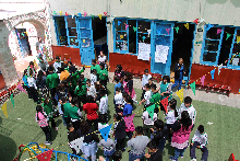 El día en la escuela comienza con la bienvenida a todos los niños de todas las edades